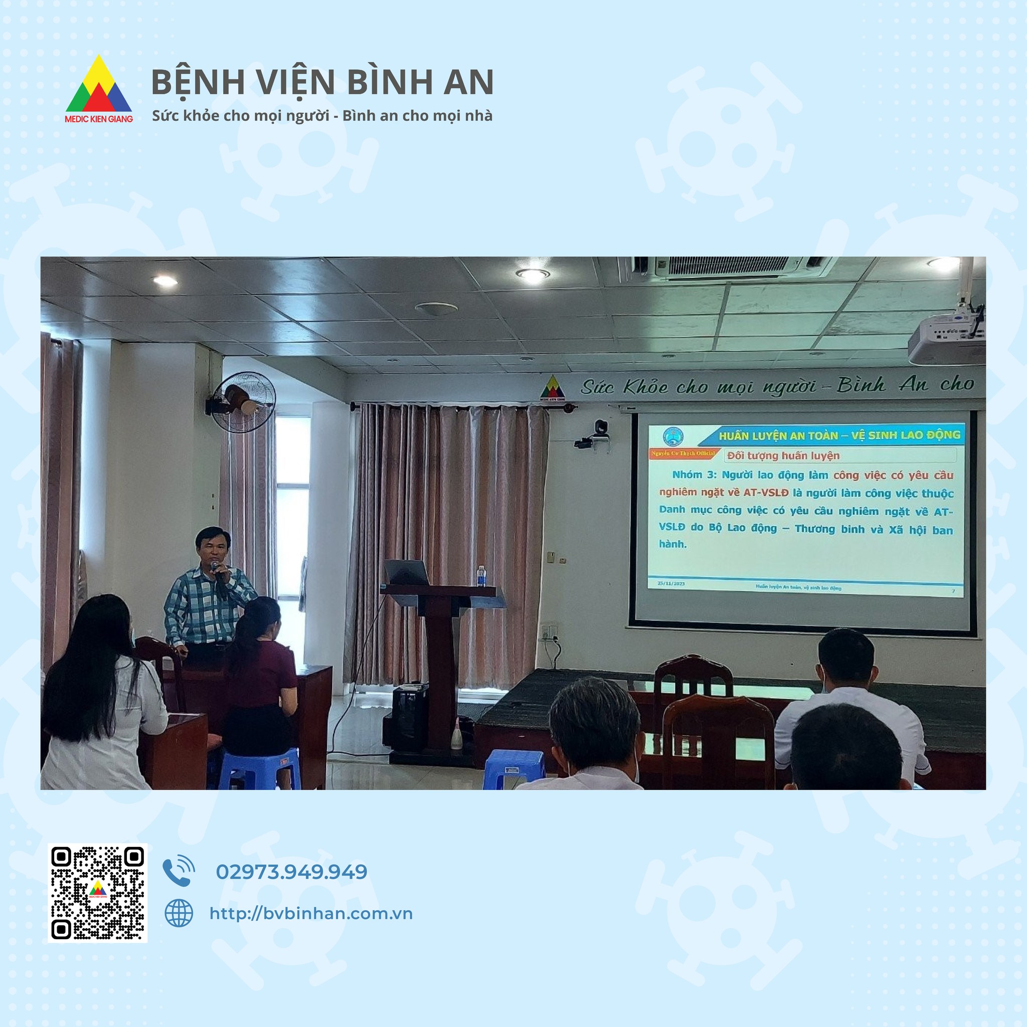 Bệnh viện Bình An đã phối hợp với đội ngũ giảng viên của Trường Cao Đẳng Nghề Kiên Giang tổ chức thành công buổi huấn luyện an toàn, vệ sinh lao động cho toàn thể nhân viên – người lao động đang công tác tại bệnh viện.