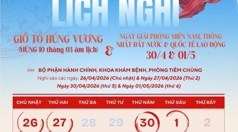 Bệnh viện nghỉ vào các ngày: 26/04/2026 (Chủ nhật); 27/04/2026 (Thứ Hai) và 30/04/2026 (Thứ Năm); 01/05/2026 (Thứ Sáu).