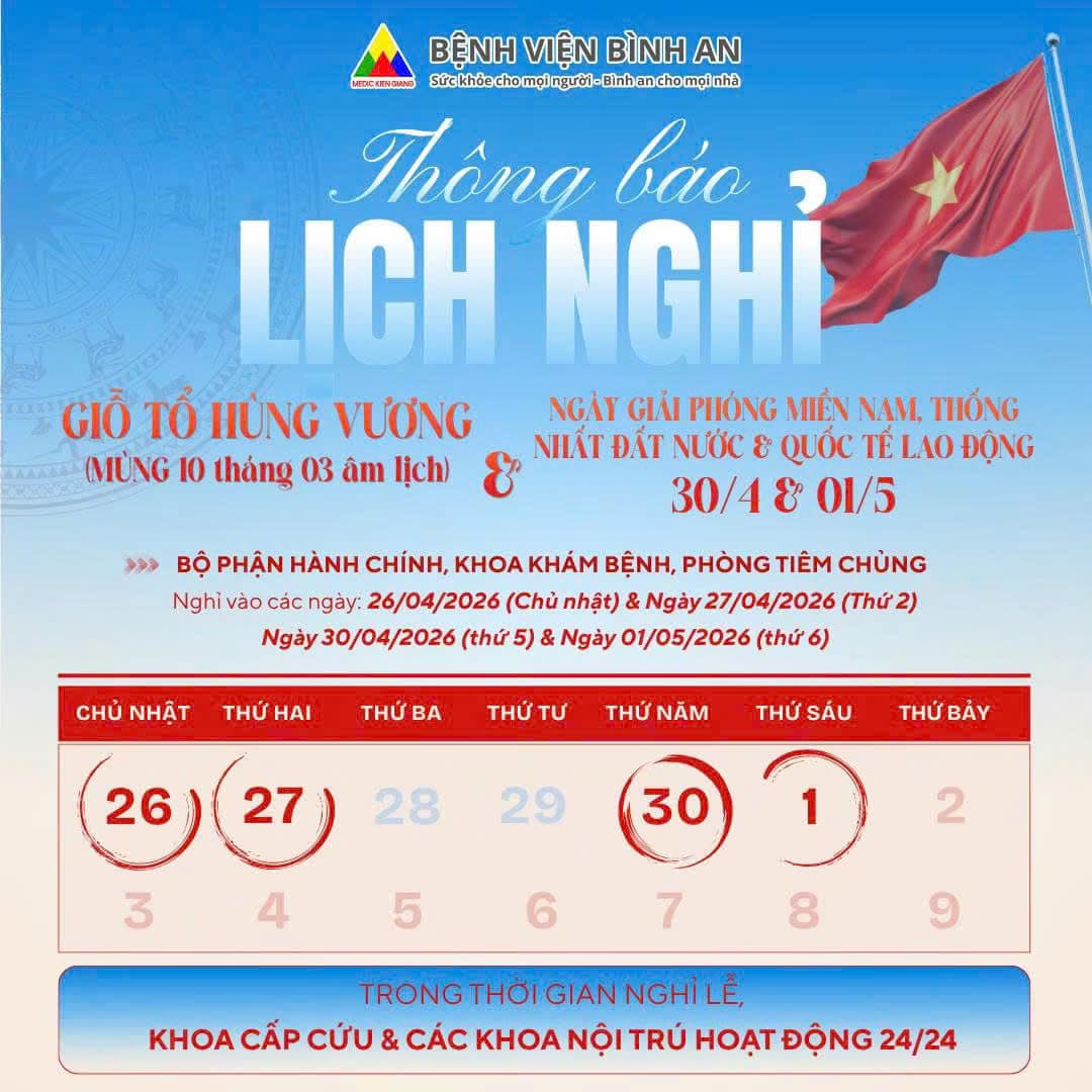 Bệnh viện Bình An trân trọng thông báo đến quý khách hàng, người bệnh và đối tác về Lịch nghỉ Lễ Giỗ Tổ Hùng Vương (mùng 10 tháng 03 âm lịch); Lễ Giải phóng Miền Nam, thống nhất đất nước (30/04) và Quốc tế Lao động (01/05), như sau: